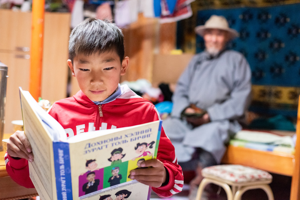 알타이시에 위치한 제3일반 교육 학교의 한 학생이 UNICEF 가  실어증 어린이들을 위해 만든 수화 책을 읽고 있습니다.