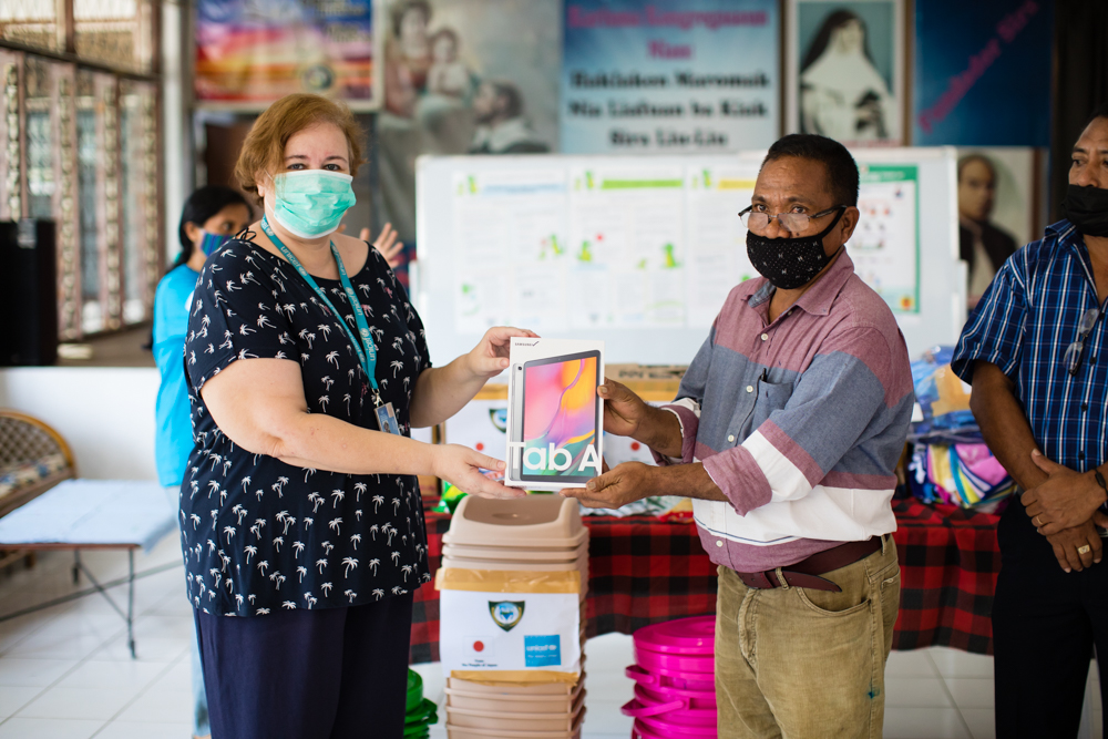 딜리의 한 아동 기숙 관리 기관에서 동티모르 주재 UNICEF 대표 Valérie Taton은 사회통합 부문으로 태블릿 PC를 인계하여 코로나19에 응대하도록 도움을 주었습니다.