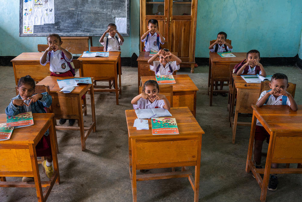 투누아 초등학교 1학년 학생들은 교실에서 공부를 하고 있습니다. 맞춤형 프로그램은 고품질의 교육 기회를 늘리고 깨끗한 물, 위생 시설 및 개인위생 서비스, 기본 건강, 어린이 보호 서비스를 제공하는 데 중점을 두었습니다.