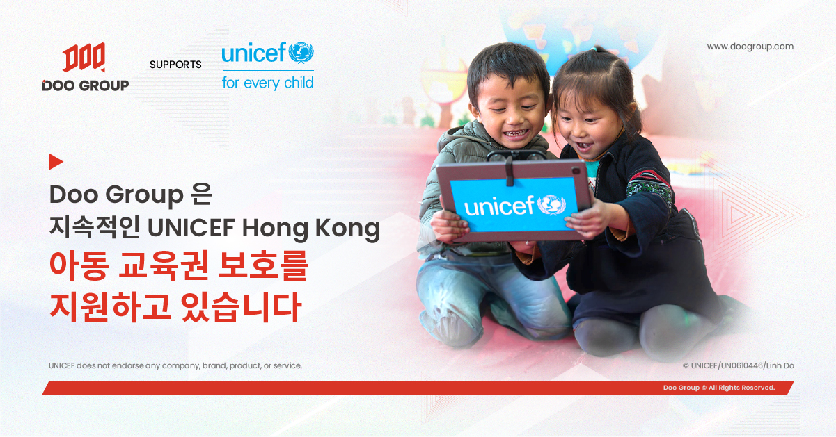 Doo Group은 UNICEF와의 협력을 통해 소외된 아동들에게 지속적인 학습 기회를 제공함으로써 아동의 잠재력을 한 단계 더 발굴하고 삶에 긍정적인 변화를 가져올 수 있게 되어 영광입니다.
