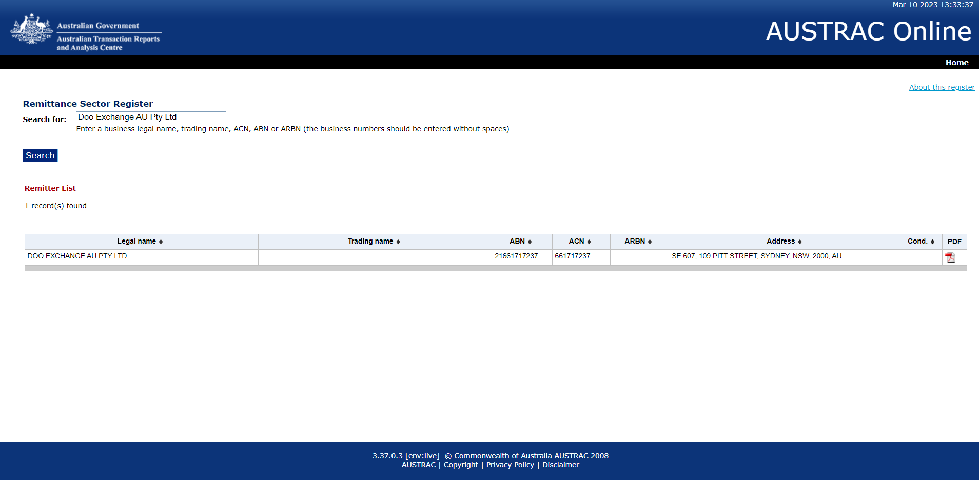 자세한 내용은 AUSTRAC 홈페이지에서 ‘Doo Exchange AU Pty Ltd’를 검색하시고 확인하세요: