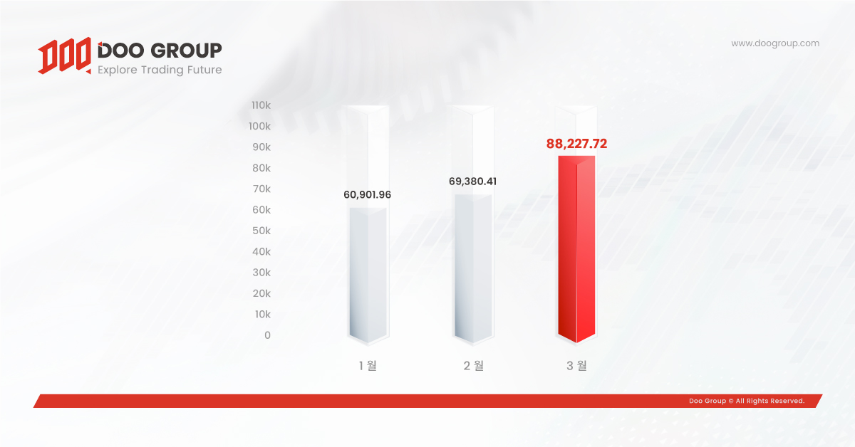 • 3월 총 거래량은 882.3억 달러입니다.