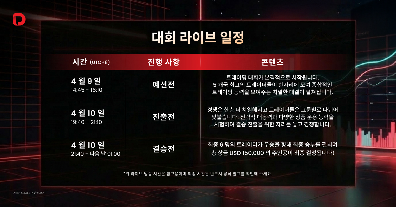 4월 9일부터 10일까지, 공식 라이브 방송을 놓치지 마세요! 5개국 트레이더들의 전략 대결을 지켜보며 총 상금 USD 150,000의 주인공이 결정되는 순간까지 함께하세요.