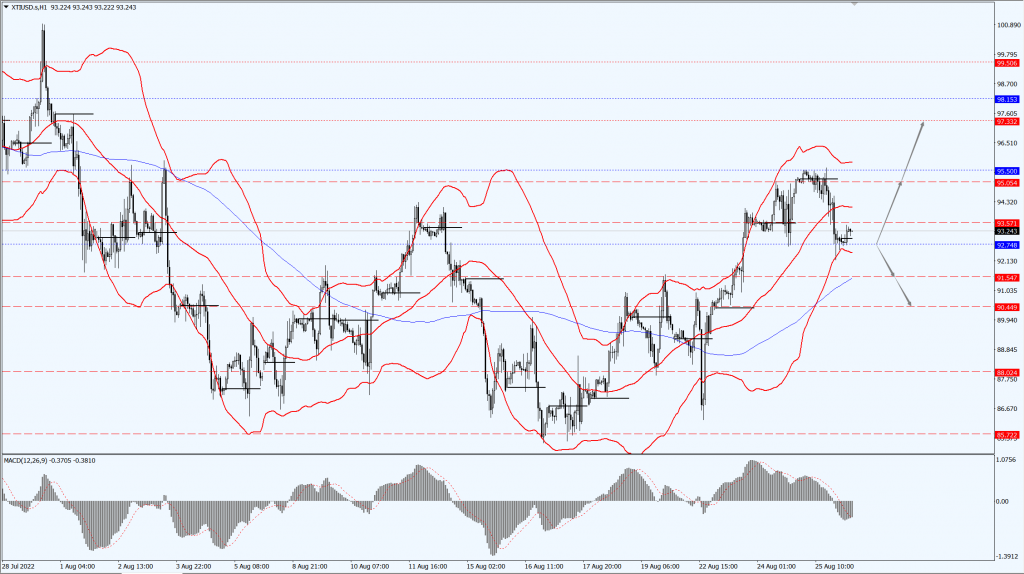 • 如果油价运行于 92.74 一线下方,届时关注 91.54 和 90.44 位置的支撑力度。