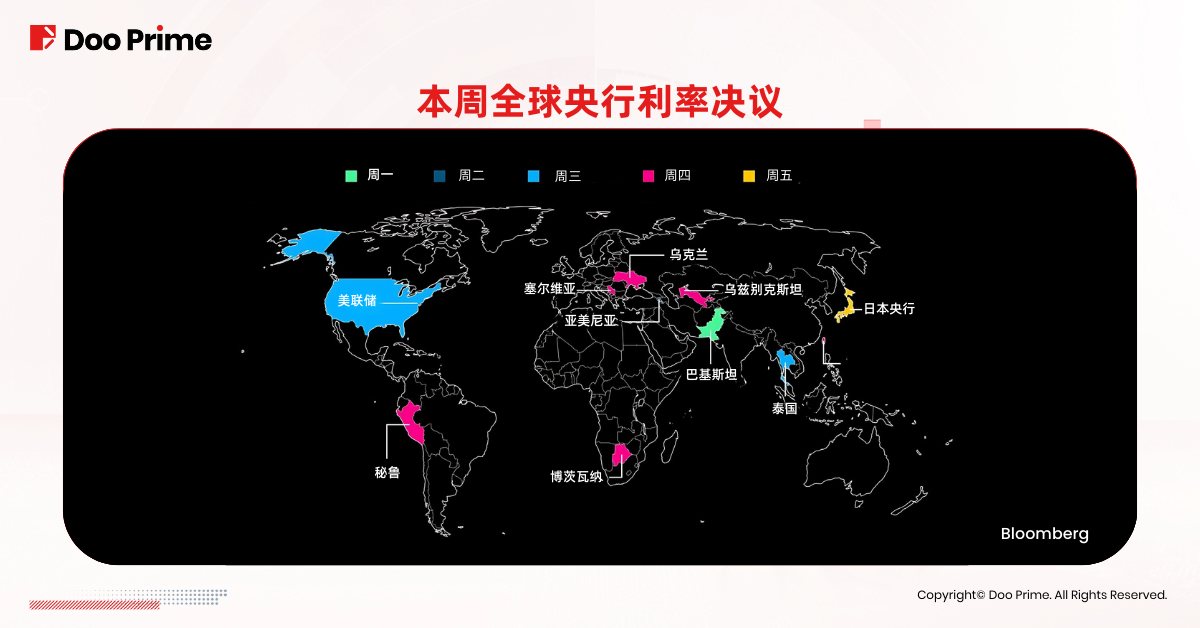 本周,全球多个央行将举行货币政策会议,包括巴基斯坦、亚美尼亚、泰国、塞尔维亚、乌克兰、乌兹别克斯坦、秘鲁、博茨瓦纳,而其中最受关注的当属美联储和日本央行。