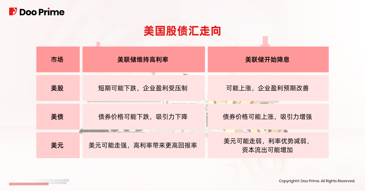如果美联储如期维持高利率,美股牛市或将结束、美债收益率或进一步上行、美元继续走高;如果美联储跟随全球降息步伐,那美股的上行动力也许将得以持续、美债价格有望上涨、而美元将开始回调。