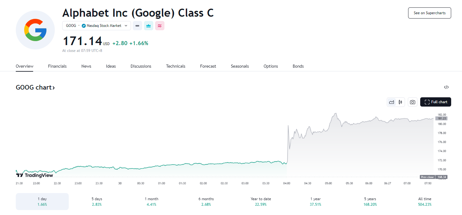 财报公布后,收涨近 1.7% 的 Alphabet 股价涨幅迅速扩大,盘后涨幅一度超过 6%。