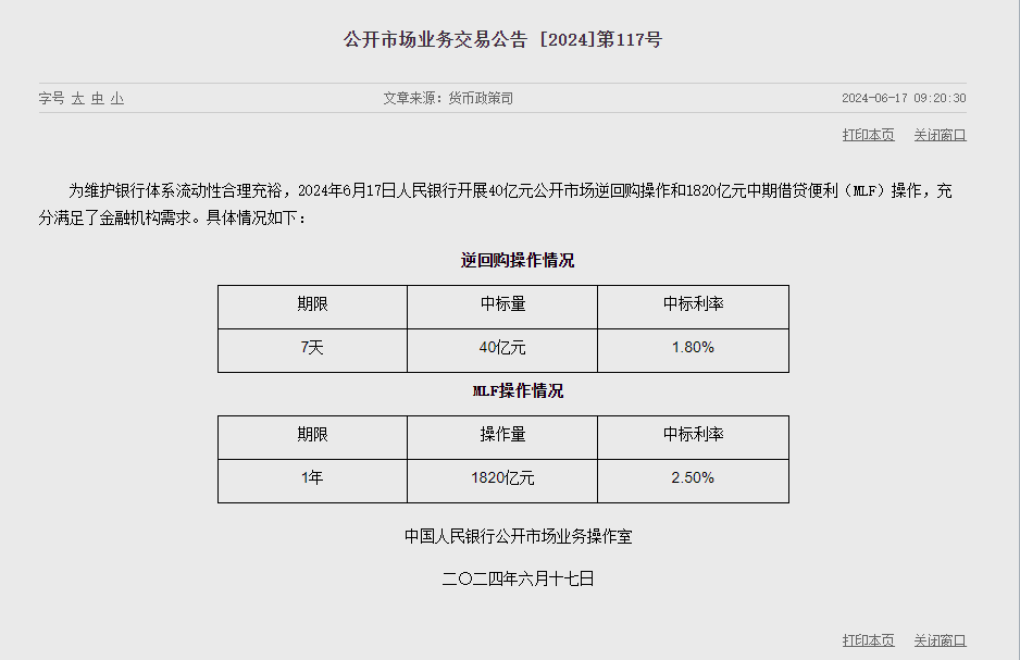 央行在公开市场业务交易公告中表示,为维护银行体系流动性合理充裕,2024 年 6 月 17 日人民银行开展 40 亿元公开市场逆回购操作和 1820 亿元 MLF 操作,充分满足了金融机构需求。