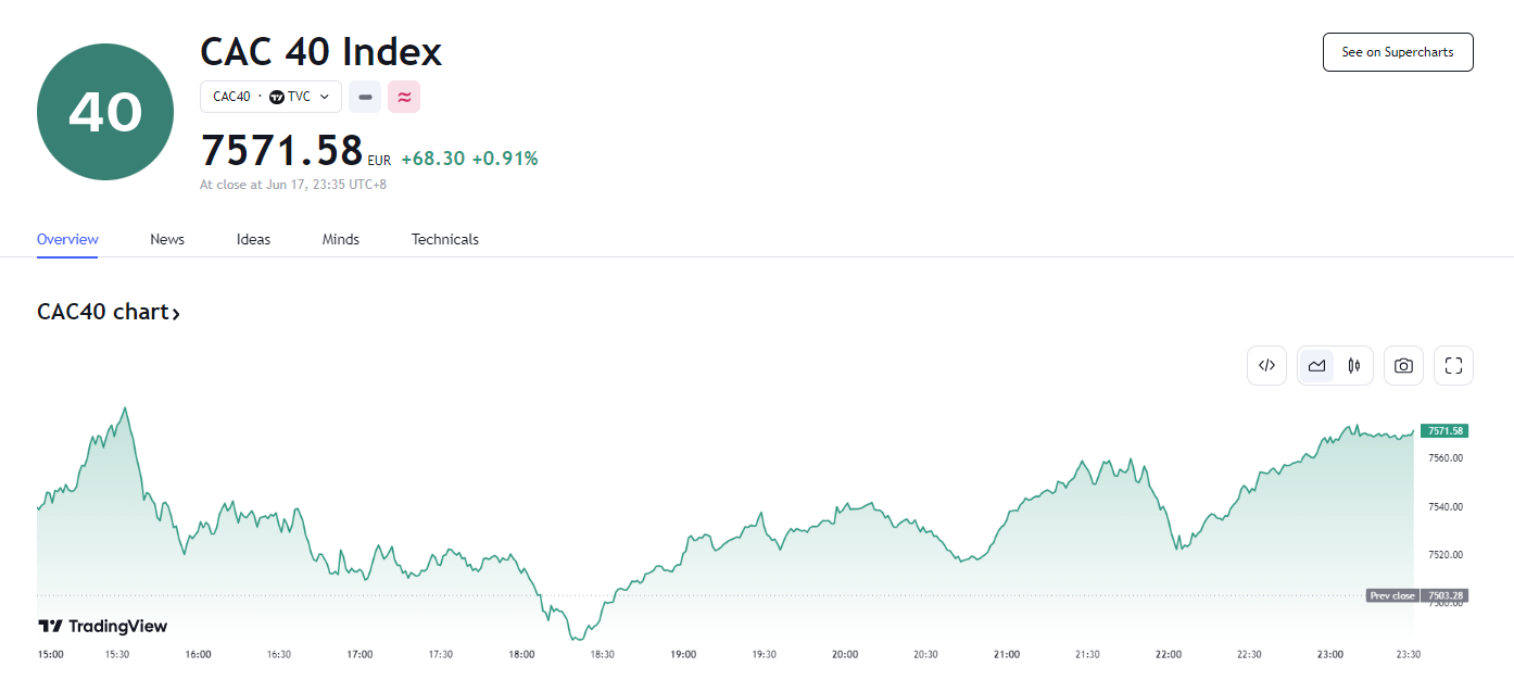 预计将在法国议会选举中占优势的极右翼国民联盟领导人勒庞(Marine Le Pen)表态,如果在选举中获胜,将与现总统马克龙确保合作。交易员们认为勒庞的表态利好,法国股市周一止跌回弹,一度上涨 1%。