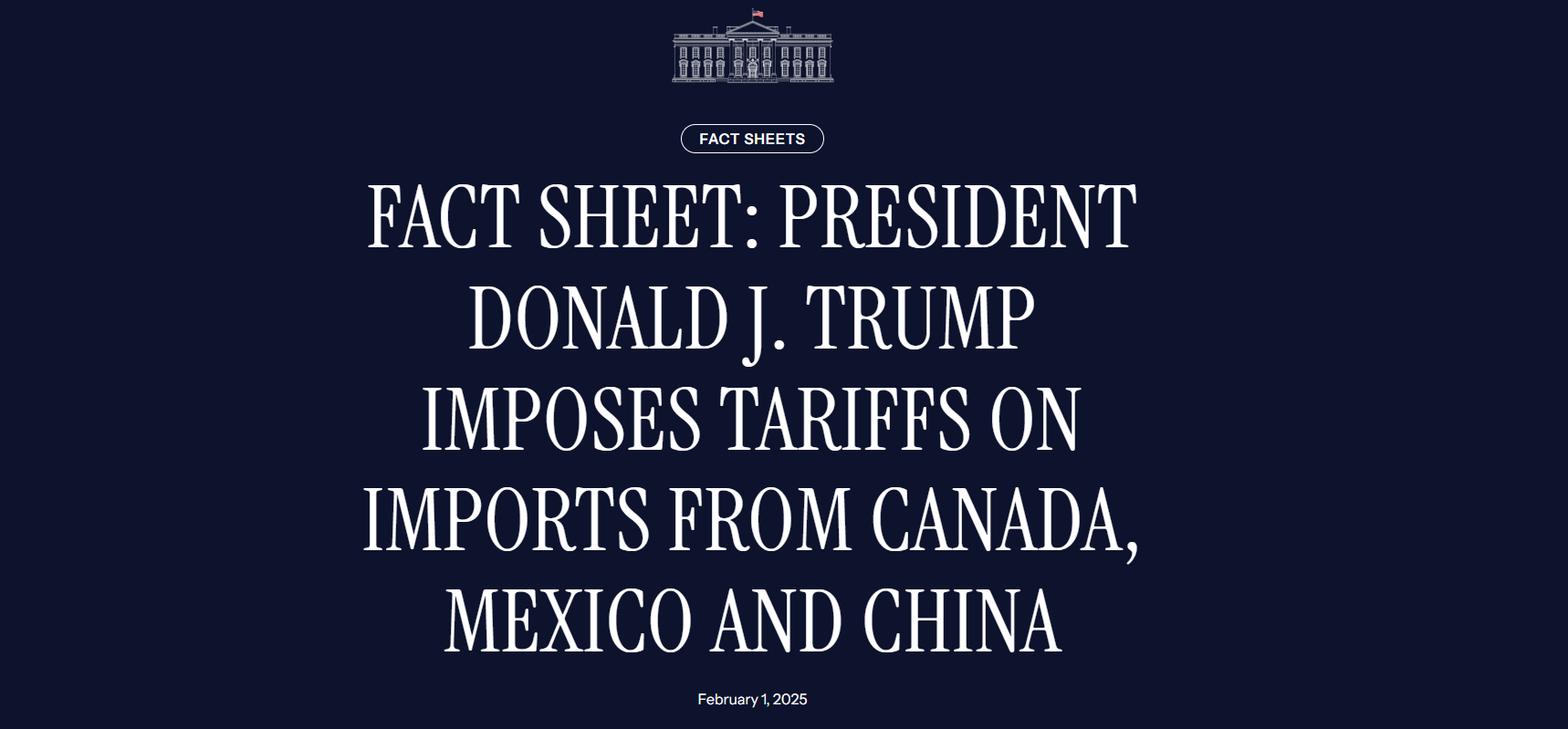 2 月 1 日,美国总统特朗普签署行政令,自 4 日起对来自加拿大和墨西哥的进口产品征收 25% 的额外关税,对来自加拿大的能源资源征收 10% 关税;对进口自中国的商品加征 10% 的关税。这三个国家是美国最大的贸易伙伴,这引发了人们对关税将导致价格上涨的担忧。