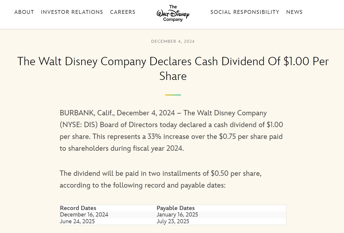 华特迪士尼公司(DIS.US)宣布明年将派发每股 1 美元的股息,将于一月和七月分两期,每期 50 美分发放给股东,较 2024 年支付给股东的每股 0.75 美元增加了 33%。