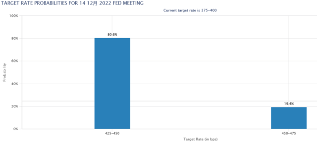 市场期望美联储在 12 月放缓加息步伐,但这在很大程度上取决于将于 12 月 14 日发布的 11 月 CPI 数据。根据芝商所美联储观察工具,市场预期 12 月加息 50 个基点的可能性为 85.4%,加息 75 基点的可能性不到 20%。然而,如果 11 月 CPI 数据暴涨,对于“誓与通胀抗争到底”的美联储而言,不排除第五次加息 75 基点的可能性。