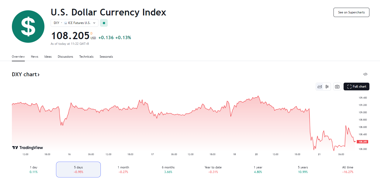 20 日,彭博美元现货指数下跌 1.1%,创 14 个月来最大跌幅,一度跌穿 108 关口,最低触及107.86,美国其他金融市场因假期休市。美元走软提振了其他外币汇率,推动欧元兑美元汇率上涨 1.6%,至 1.0434。