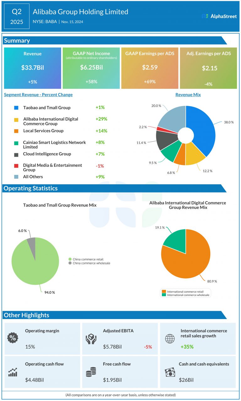 11 月 15 日,阿里巴巴集团发布 2025 财年第二季度财报,显示公司季度收入 2365.03 亿元,同比增长 5%,低于预期 2394.3 亿元。得益于股权投资按市值计价的变化、投资减值的减少以及公司经营利润的提升,归属于普通股股东的净利润同比增长了 63%。此外,今年双 11 期间,淘宝天猫 GMV 实现强劲增长,买家数量创历史新高。