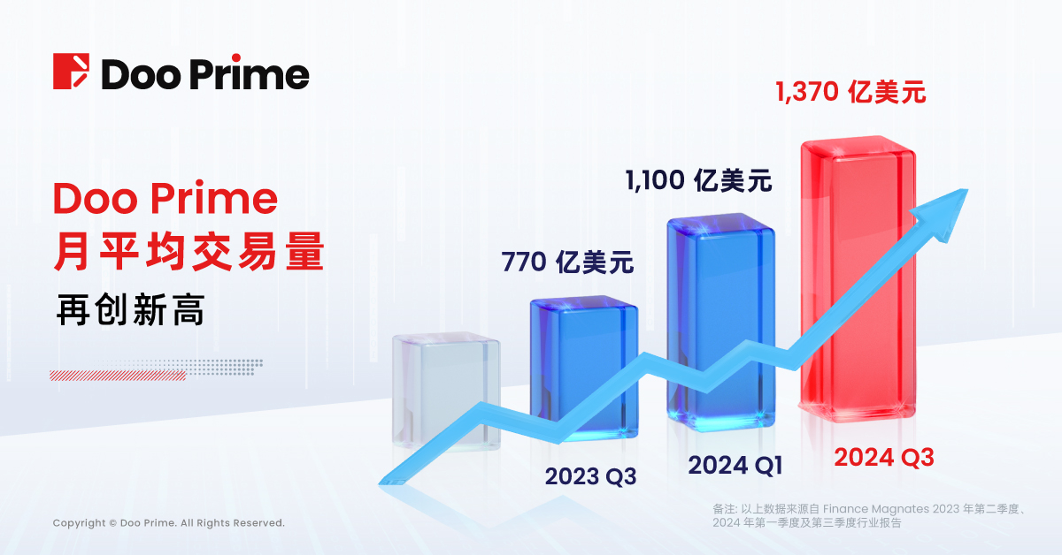 与 2023 年第二季度的 14.3 万客户相比,Doo Prime 平台的客户规模持续扩大,在全球市场环境放缓的情况下,客户量仍增长了 15.4%。而在交易量排名方面,Doo Prime 的表现也十分亮眼。Finance Magnates 报告中显示,Doo Prime 在 2024 年第三季度的月平均交易量达到了 1,370 亿美元,全球交易量排名从第一季度的第 26 位提升至第 24 位。这不仅真实反映了 Doo Prime 不断增强的市场竞争力,还体现了全球交易者对平台的高度认可。