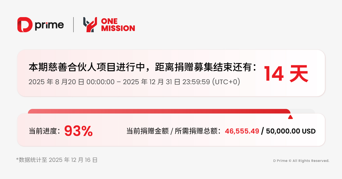 目前,距离 2025 D Prime 慈善合伙人计划募集期结束仅剩两周时间!云县特教学校运动场建设项目的善款捐赠金额已突破 90% 大关——这不仅仅是一个数字,更是无数温暖的汇聚。每一个特殊儿童的运动梦想,都因为您的参与而离现实更近一步。现在,让我们共同完成这最后的冲刺,用交易的温度注满最后一段爱心进度条。