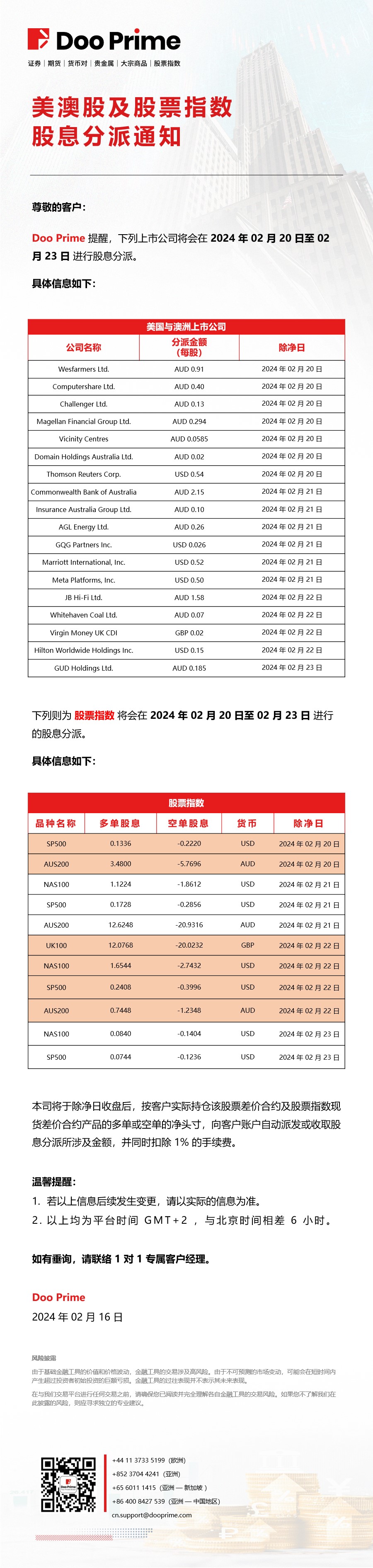 美澳股及股票指数​股息分派通知​