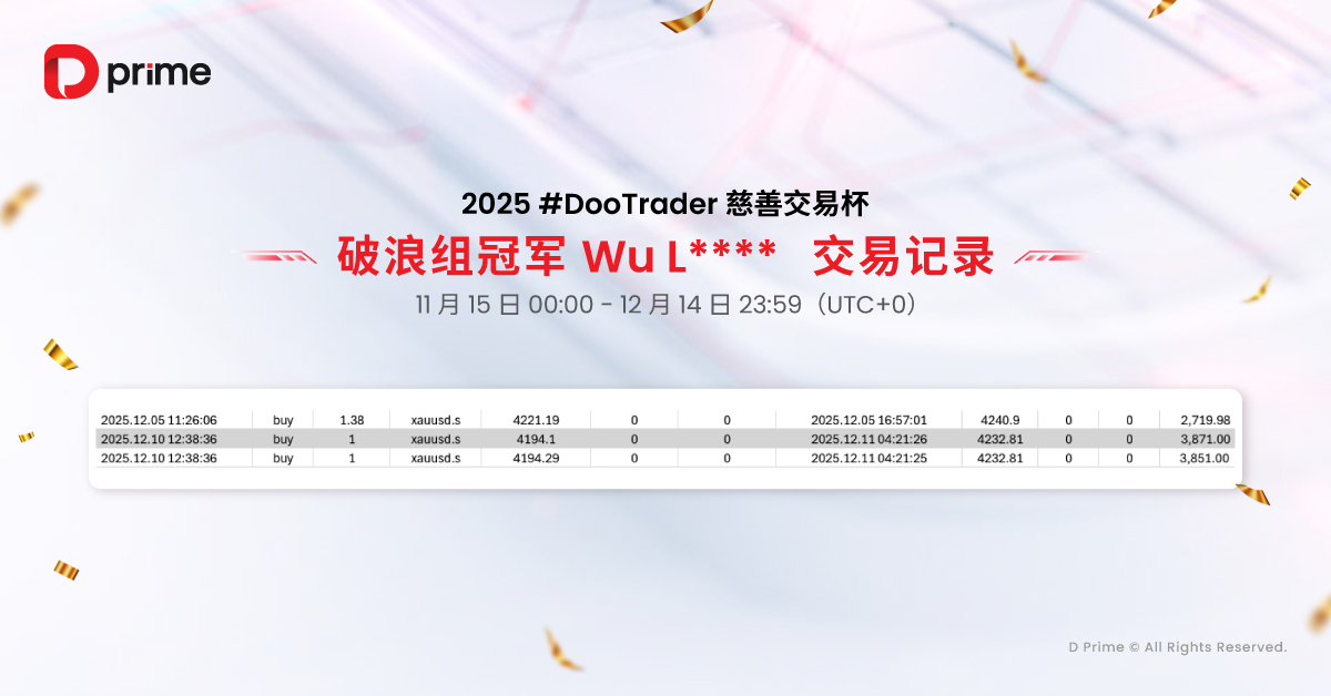 值得关注的是,2025 #DooTrader 慈善杯交易杯不仅是一场较量,更是一个传递爱心的公益活动。每当您在比赛中完成 1 手交易,D Prime 都将代表您捐出 0.1 美元,帮助改善贫困儿童的教育条件,让您的每一笔交易助力点亮更多孩子的未来。