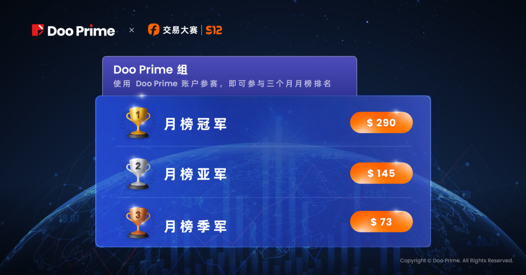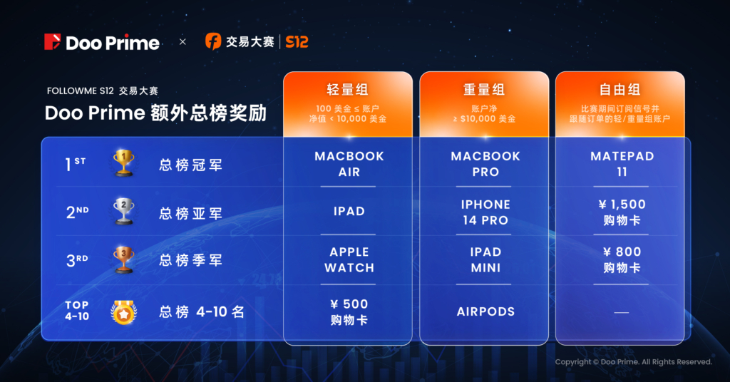 借助平台发展优势和信任背书, Doo Prime 用户将有机会争夺总榜超过 55,000 美金奖励;此外,在 S12 交易大赛期间,用户通过 FOLLOWME 平台首次创建 Doo Prime 账户,不仅可以获得月榜奖励,还有机会赢得 MacBook Pro、iPhone 14 Pro 、iPad mini 等热门 3C 数码奖品以及大额购物卡。Doo Prime 期待与您携手,共同在交易路上赢得更多荣誉与福利;