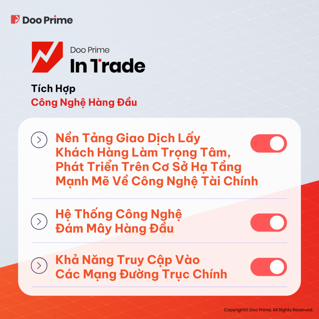 Doo Prime InTrade được phát triển với hệ thống cơ sở hạ tầng công nghệ tài chính đầy mạnh mẽ. Cụ thể, nền tảng và ứng dụng giao dịch dành cho thiết bị di động này được trang bị bởi công nghệ đám mây và hệ thống mạng hàng đầu. Đồng thời, Doo Prime InTrade còn cho phép người dùng truy cập vào các mạng đường trục chính trên toàn cầu, từ đó cung cấp cho người dùng một môi trường giao dịch ổn định và đáng tin cậy.