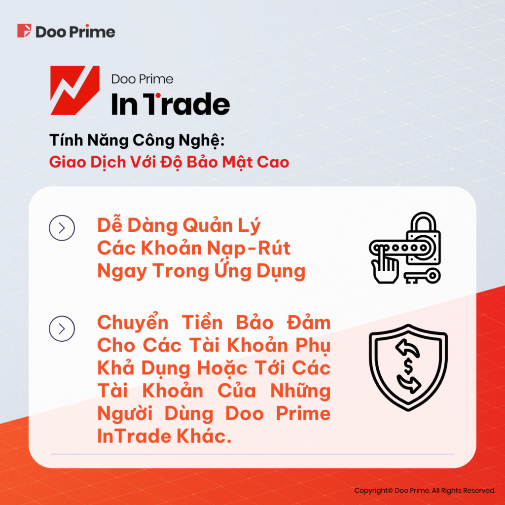Doo Prime InTrade được phát triển theo hướng mà người dùng có thể quản lý các khoản nạp-rút một cách thuận tiện và nhanh chóng ngay trong ứng dụng. Ngoài ra, người dùng có thể chuyển tiền vào các tài khoản phụ đang khả dụng, hoặc chuyển đến tài khoản của những người dùng Doo Prime InTrade khác.