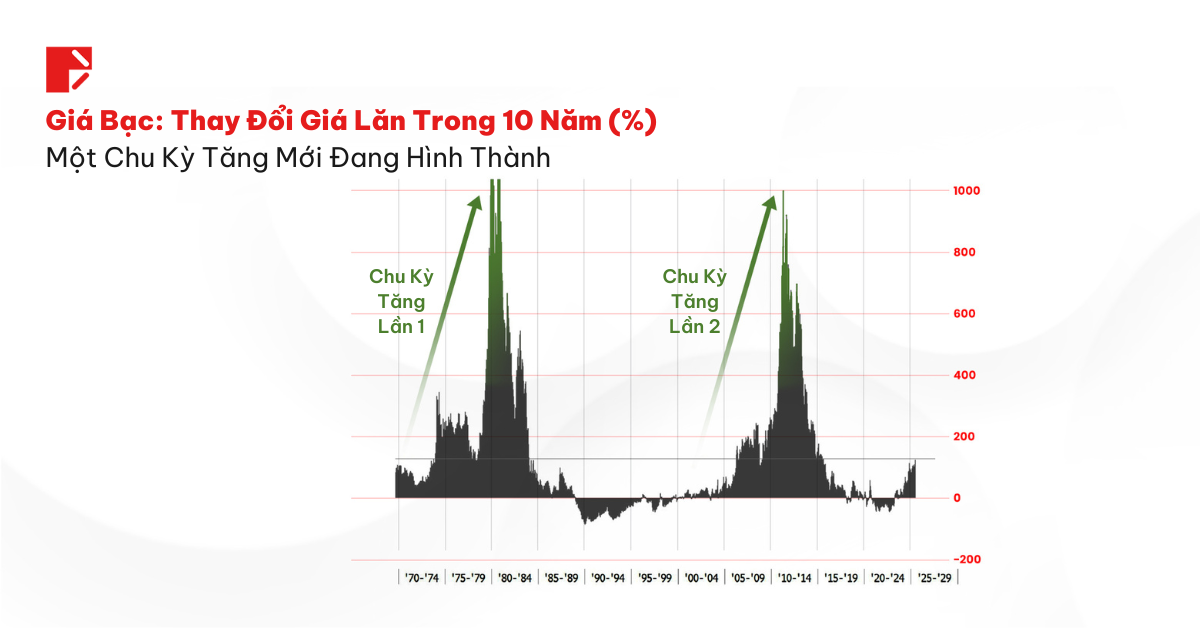 Biểu đồ trên đây đã cho thấy sự thay đổi giá lăn trong suốt 10 năm của bạc, từ đó thể hiện hai thị trường giá tăng chính vào những năm 1970 và 2000. Ở mỗi giai đoạn, bạc luôn sở hữu mức biến động mạnh mẽ đến sửng sốt: từ việc bị lãng quên, và rồi trở về với mức tăng vọt đáng kể.