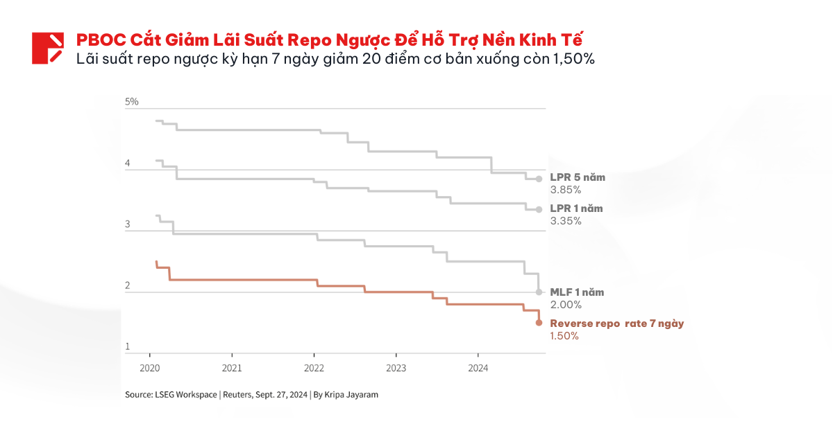 PBOC cũng đã thực hiện thỏa thuận mua lại đảo ngược (reverse repo) kỳ hạn 7 ngày trị giá 160,1 tỷ nhân dân tệ (khoảng 22,7 tỷ USD) với lãi suất 1,7%. Bên cạn đó, là thỏa thuận tương tự kỳ hạn 14 ngày, tổng trị giá 74,5 tỷ nhân dân tệ với lãi suất 1,85%, thấp hơn so với lãi suất 1,95% trước đây.