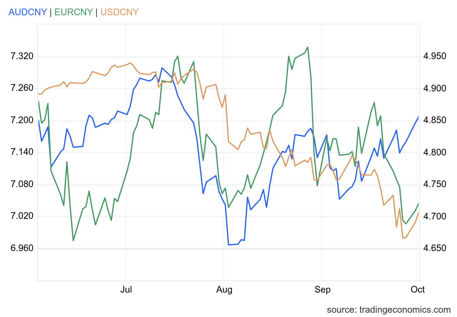 Biểu đồ dưới đây là hiệu suất của CNY với EUR, USD và AUD.