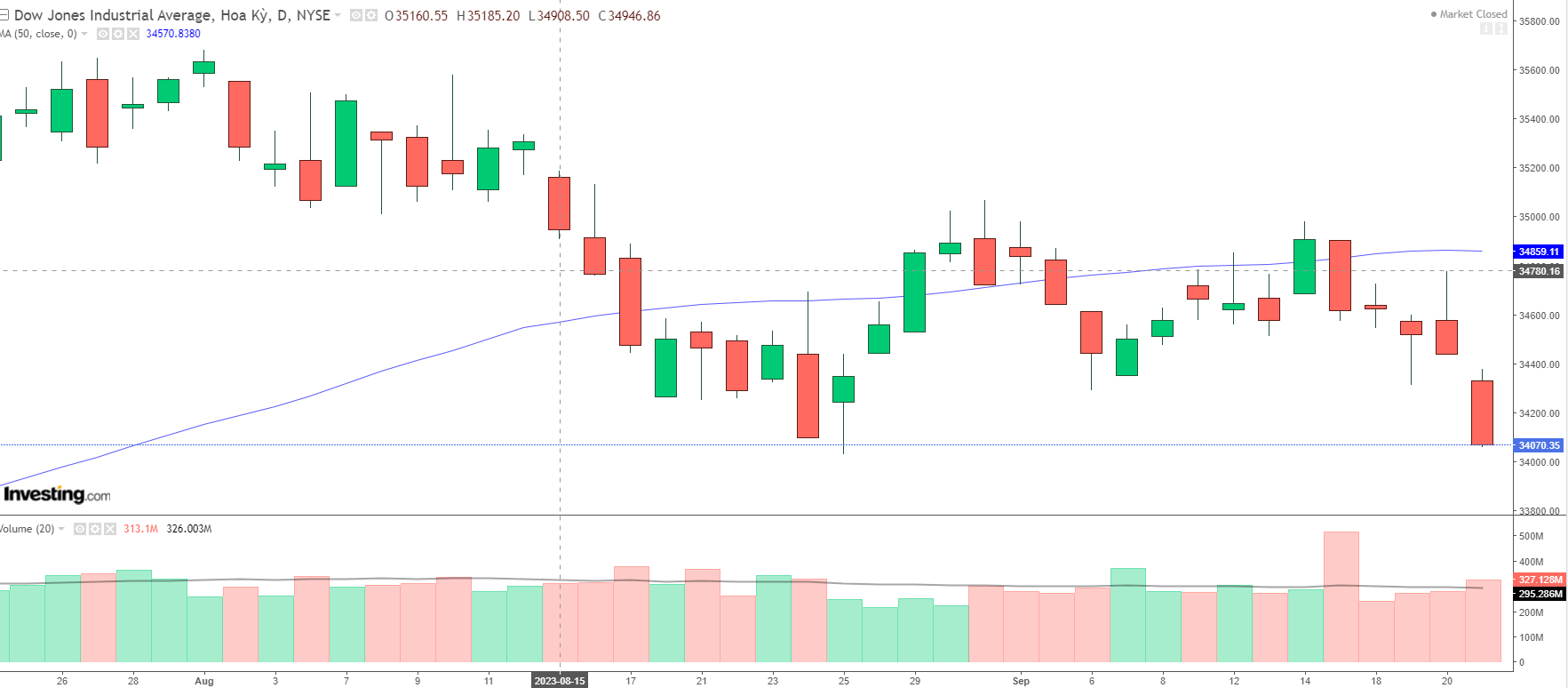 Kết thúc phiên giao dịch ngày thứ Năm, chỉ số Dow Jones rớt 370.46 điểm (tương đương 1.08%) xuống 34,070.42 điểm. Chỉ số S&P 500 lùi 1.64% xuống 4,330 điểm. Chỉ số Nasdaq Composite mất 1.82% còn 13,223.98 điểm.